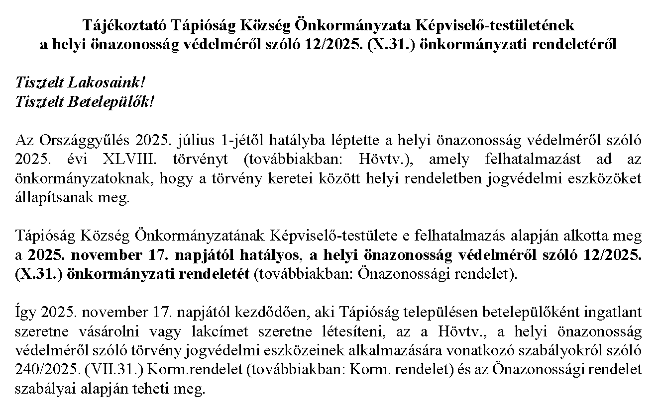 Helyi önazonosságPublikálva: 2025. november 05. (szerda) 01:57 Tájékoztató önazonossági rendeletről.pdf Mentességi kérelem.pdf Méltányossági kérelem.pdf Lakcímlétesítési kérelem.pdf Szerződés közzététele iránti kérelem.pdf